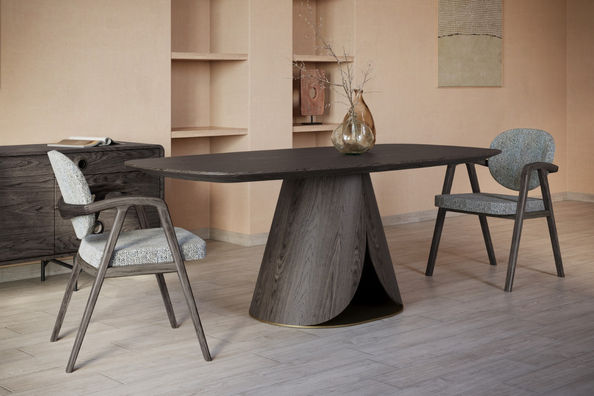 Η τραπεζαρία KAPPA Oval αποτελεί ένα εξαιρετικό δείγμα σύγχρονου design που συνδυάζει την εκλεπτυσμένη αισθητική με τη λειτουργικότητα. Η χαρακτηριστική της ξύλινη οβάλ επιφανειά αποπνέει ζεστασιά και κομψότητα, ενώ η γλυπτική της βάση με δυναμικές κυρτές γραμμές δίνει μία αρχιτεκτονική διάσταση που τραβά τα βλέμματα. Η KAPPA Oval είναι ιδανικό για χώρους που αναζητούν μια statement παρουσία χωρίς υπερβολές. Η γεωμετρία του τραπεζιού προσφέρει άνεση και ισορροπία, ενώ η μοναδική σχεδίαση της βάσης επιτρέπει την εργονομική τοποθέτηση καθισμάτων γύρω του. Ένα κομμάτι υψηλής αισθητικής, φτιαγμένο για να αναδείξει κάθε χώρο με στιλ και διαχρονικό χαρακτήρα.